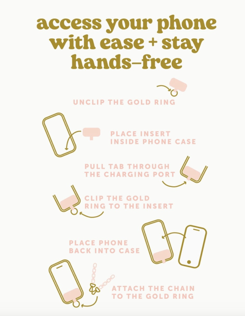 Access your phone with ease and stay hands-free! Designed to fit all phone cases Live a hands-free lifestyle Attach and remove from your phone easily Charge your phone without removing your phone chain Shorten length by removing links as needed Chain length: 56”