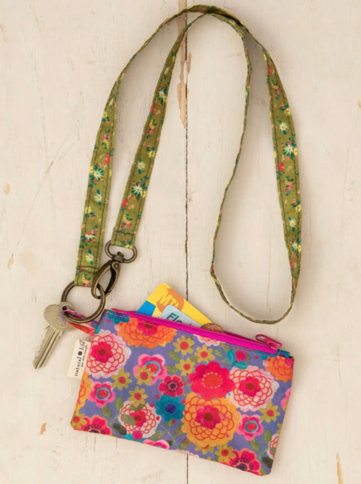 Zip pouch lanyard features antique brass lobster clip and key ring.