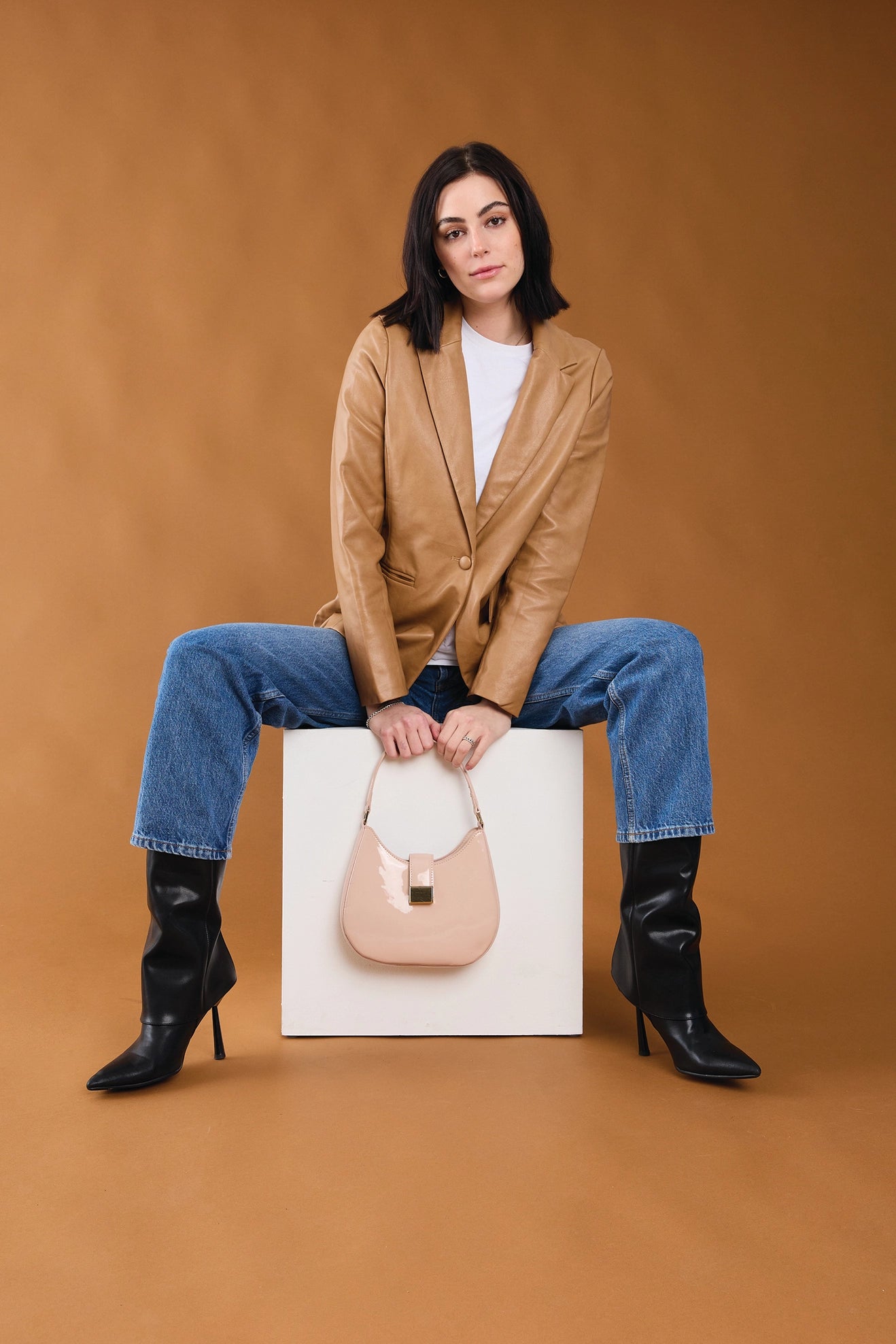 Item Details: -High Gloss Finish: A sleek and polished curved design that adds a sophisticated shine to your look. -Metal Accent Closure: Secure your essentials with the stylish metal accent snap closure, blending functionality with elegance. -Removable Chain Strap: Personalize your carry with the removable gold chain strap, allowing you to effortlessly switch between a shoulder bag and a chic handheld accessory. Dimensions: -Length: 9 inches -Height: 7.5 inches -Depth: 2 inches