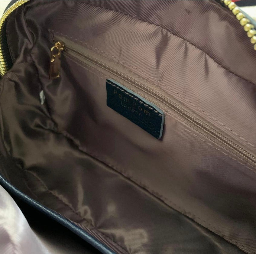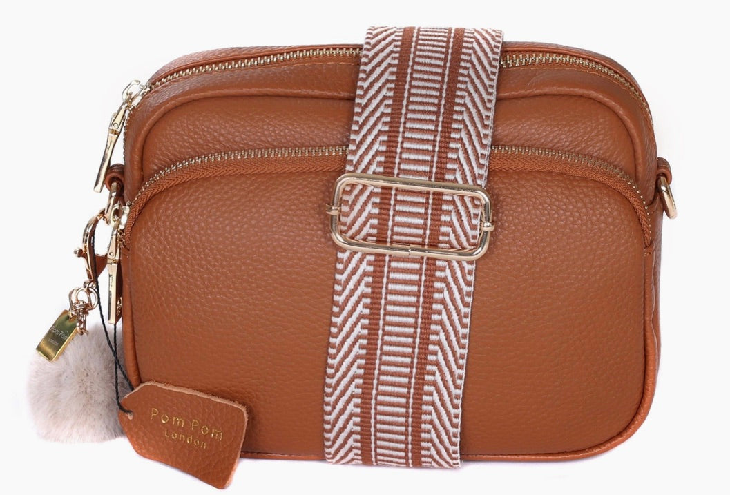 BRAND New style just in! Turn heads for all the right reasons this season. Pick up the newest Pom Pom London Mayfair Bag Tan whilst we have stock! * FREE dust bag included * Designed in the UK * Made for Pom Pom London * 100% Leather * Hardware in a yellow gold tone * 3 compartments with zips Included: * Matching thin leather adjustable strap extending to 122cm * Pom Pom London leather embossed tag * FREE mini pom pom keyring worth £12.