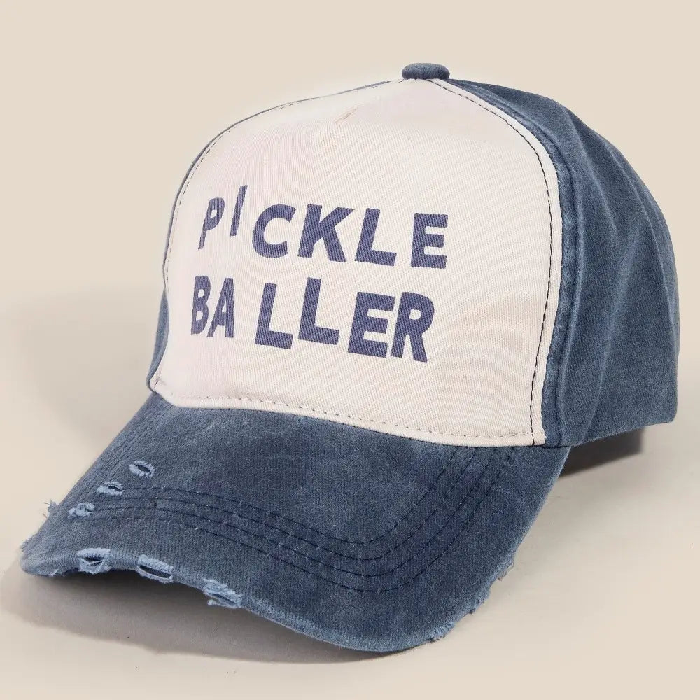 This piece is the perfect way to add some glamour to your look, this trucker hat adds a distinctive pickle baller distressed denim design. Elevate your fashion IQ with this versatile trucker hat, designed to seamlessly integrate into any style profile. Available in B, BL, BUR, KH. This item is sold in packs of 2. This trucker hat is made with 100% Cotton.