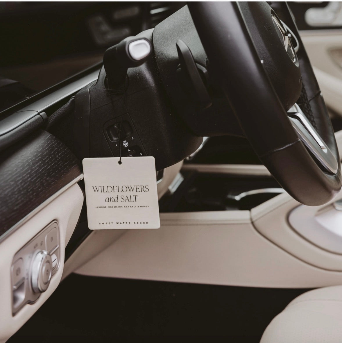 SCENT NOTES: • Top: Lemon, Rosemary, Leafy Green • Middle: Jasmine, Lily, Honey, Violet • Base: Sea Salt, Amber, Musk DETAILS: • Size: 3" x 3" • Package Size: 7.25" x 3.25" • Tan with black hanging • Scratch and Smell on packaging • Lasts up to 2 months • Premium Fragrance Oil • Gluten Free, Phthalate Free, Non-Toxic, Cruelty Free • Made in the USA